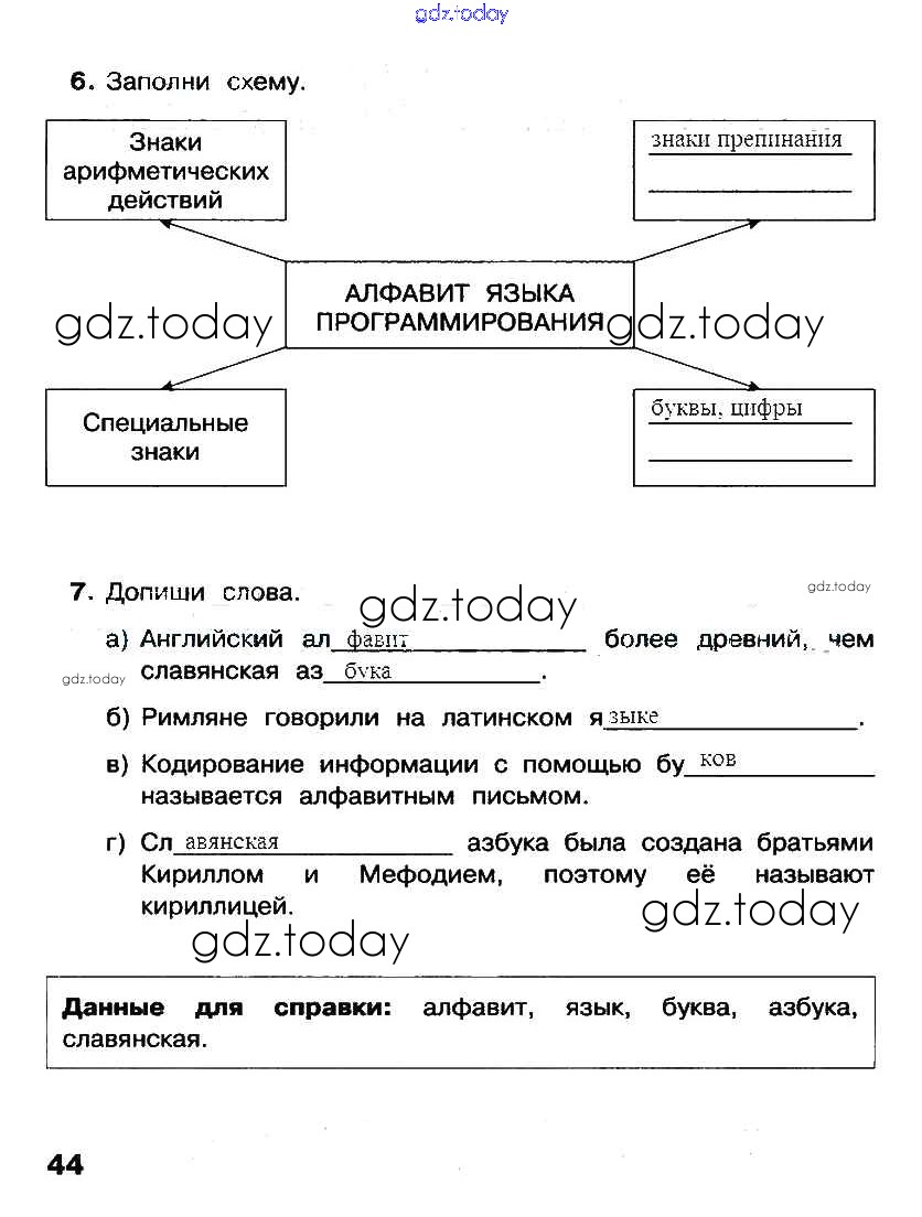 На страницах сайта gdz.today вы найдете учебный и вспомогательный материал, направленный на улучшения знаний школьной программы. ГДЗ - онлайн мир знаний §9. Языки людей и языки программирования Решение к части 1. Страницы стр. 44 Рабочей тетради по Информатике для 2 класса Матвеева, Челак Бином УМК 2012