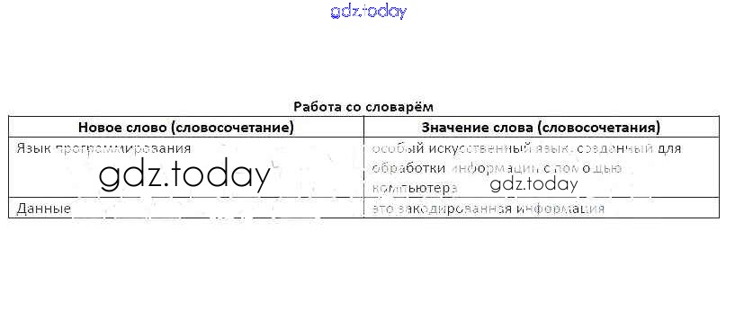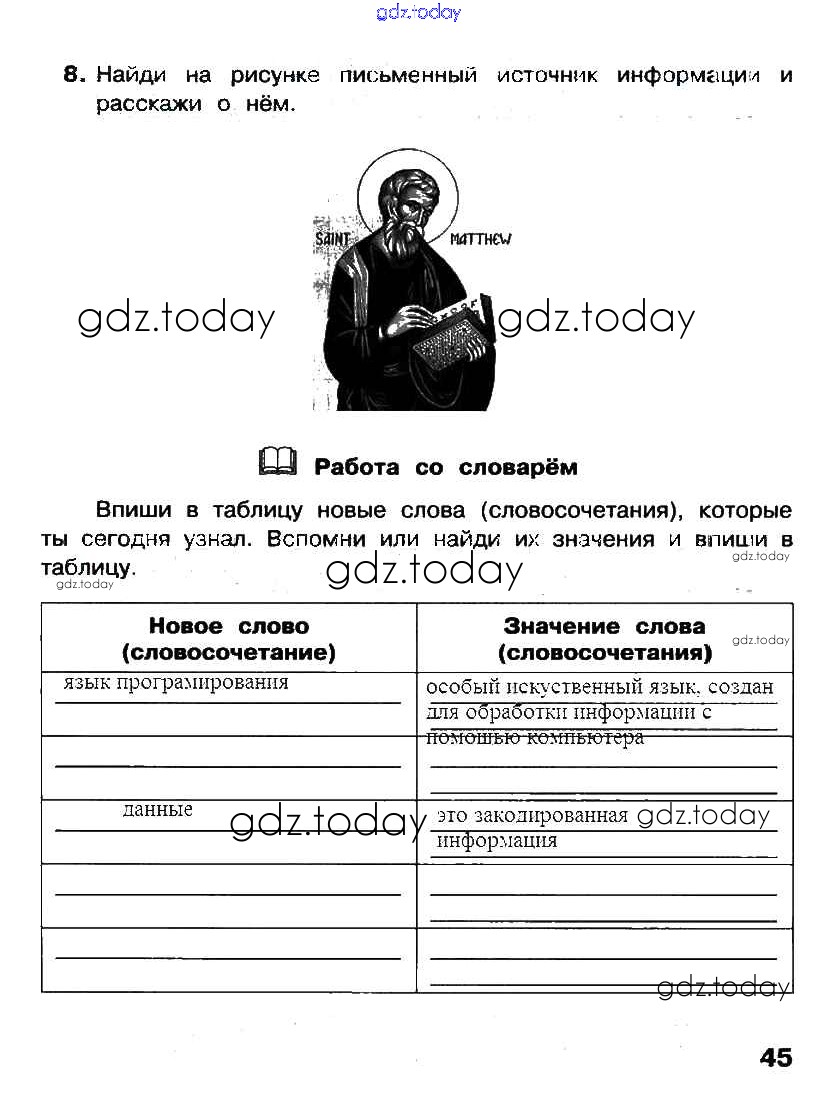 На страницах сайта gdz.today вы найдете учебный и вспомогательный материал, направленный на улучшения знаний школьной программы. ГДЗ - онлайн мир знаний §9. Языки людей и языки программирования Решение к части 1. Страницы стр. 45 Рабочей тетради по Информатике для 2 класса Матвеева, Челак Бином УМК 2012