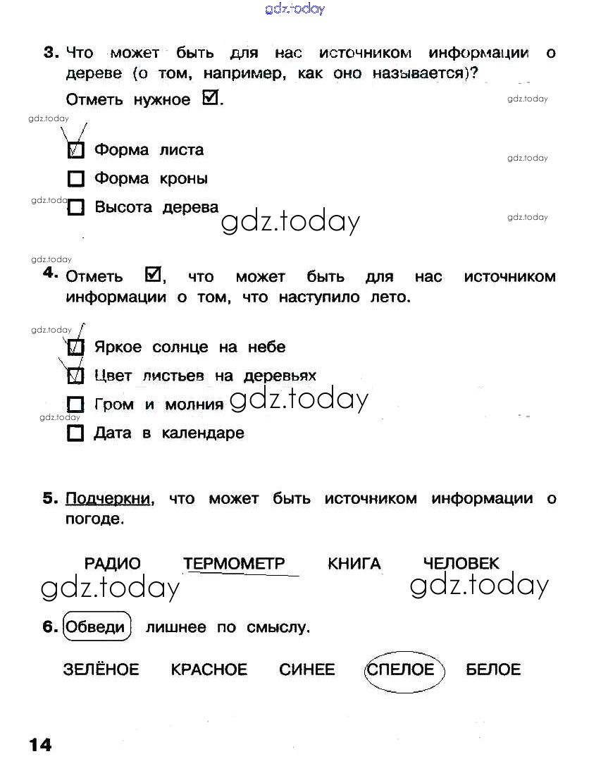 На страницах сайта gdz.today вы найдете учебный и вспомогательный материал, направленный на улучшения знаний школьной программы. ГДЗ - онлайн мир знаний §3. Источники информации Решение к части 1. Страницы стр. 14 Рабочей тетради по Информатике для 2 класса Матвеева, Челак Бином УМК 2012