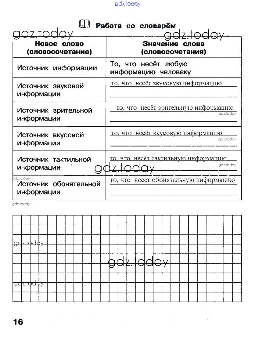 На страницах сайта gdz.today вы найдете учебный и вспомогательный материал, направленный на улучшения знаний школьной программы. ГДЗ - онлайн мир знаний §3. Источники информации Решение к части 1. Страницы стр. 16 Рабочей тетради по Информатике для 2 класса Матвеева, Челак Бином УМК 2012
