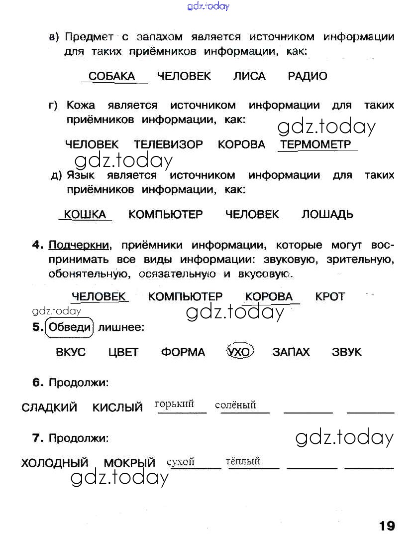 На страницах сайта gdz.today вы найдете учебный и вспомогательный материал, направленный на улучшения знаний школьной программы. ГДЗ - онлайн мир знаний §4. Приемники информации Решение к части 1. Страницы стр. 19 Рабочей тетради по Информатике для 2 класса Матвеева, Челак Бином УМК 2012
