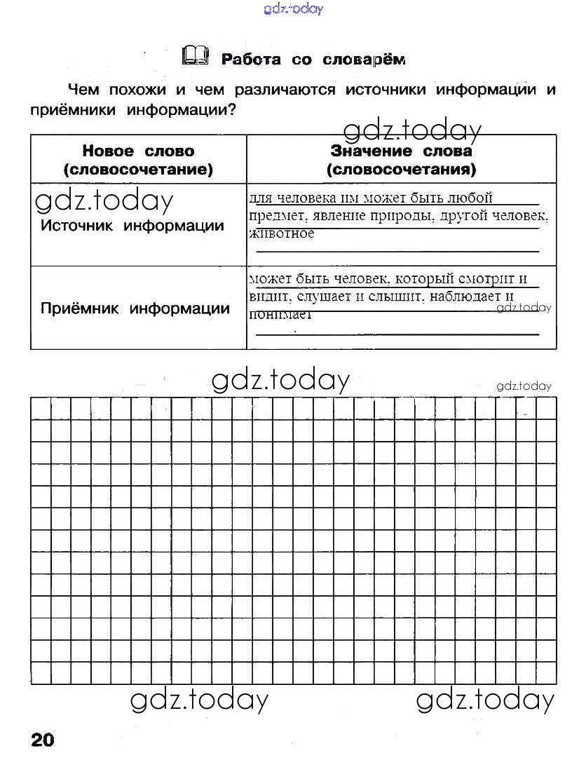 На страницах сайта gdz.today вы найдете учебный и вспомогательный материал, направленный на улучшения знаний школьной программы. ГДЗ - онлайн мир знаний §4. Приемники информации Решение к части 1. Страницы стр. 20 Рабочей тетради по Информатике для 2 класса Матвеева, Челак Бином УМК 2012