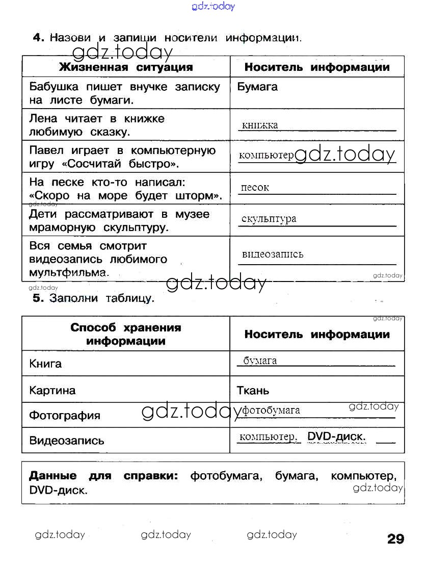 На страницах сайта gdz.today вы найдете учебный и вспомогательный материал, направленный на улучшения знаний школьной программы. ГДЗ - онлайн мир знаний §6. Носители информации Решение к части 1. Страницы стр. 29 Рабочей тетради по Информатике для 2 класса Матвеева, Челак Бином УМК 2012
