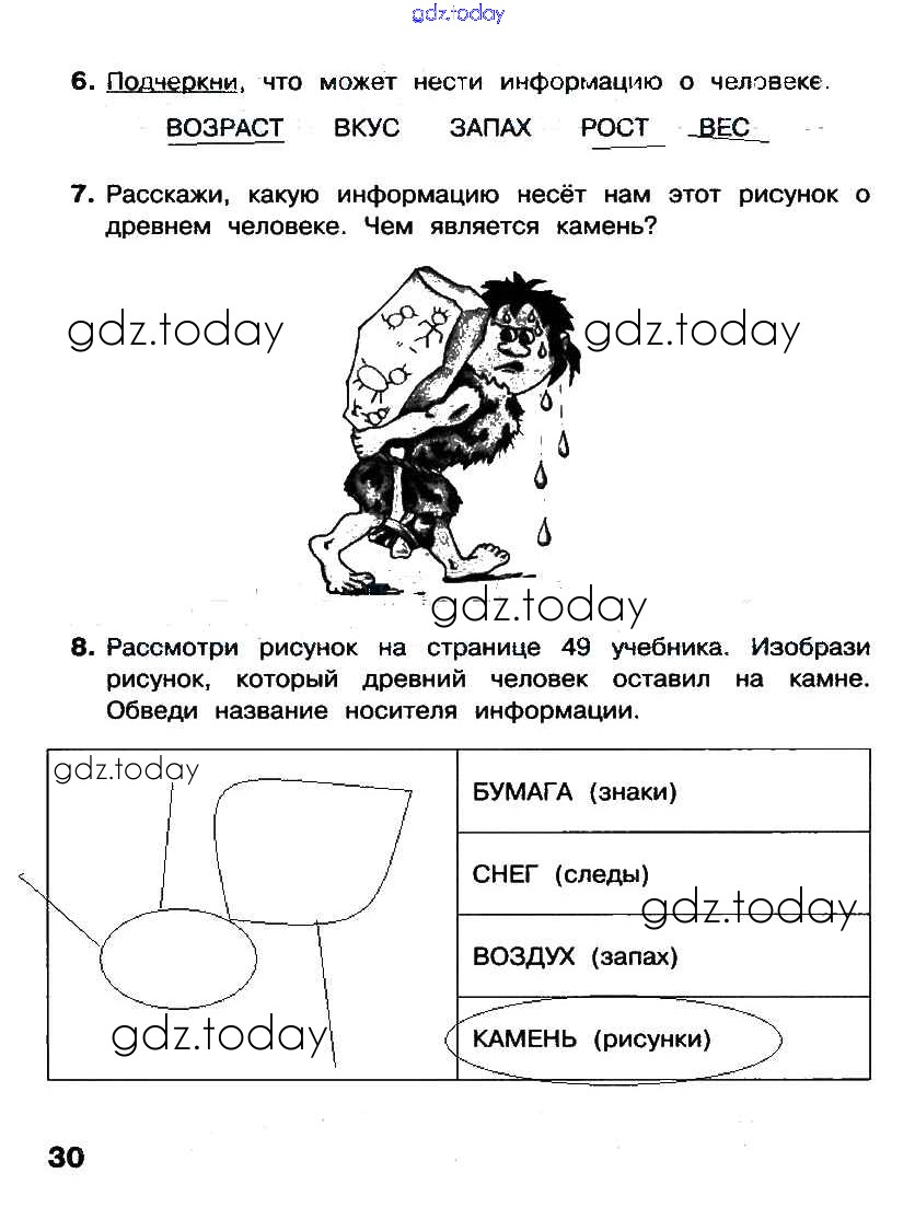 На страницах сайта gdz.today вы найдете учебный и вспомогательный материал, направленный на улучшения знаний школьной программы. ГДЗ - онлайн мир знаний §6. Носители информации Решение к части 1. Страницы стр. 30 Рабочей тетради по Информатике для 2 класса Матвеева, Челак Бином УМК 2012