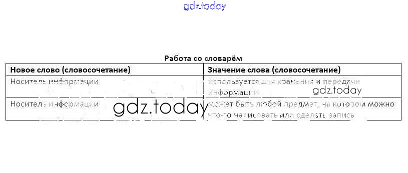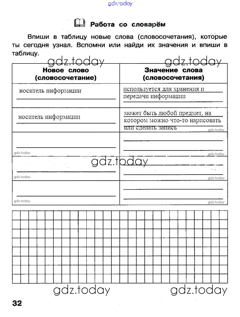 На страницах сайта gdz.today вы найдете учебный и вспомогательный материал, направленный на улучшения знаний школьной программы. ГДЗ - онлайн мир знаний §6. Носители информации Решение к части 1. Страницы стр. 32 Рабочей тетради по Информатике для 2 класса Матвеева, Челак Бином УМК 2012