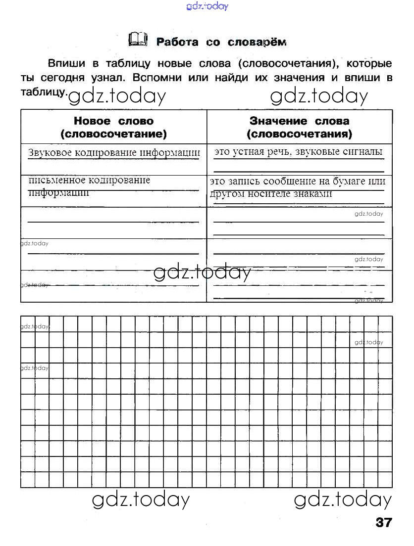 На страницах сайта gdz.today вы найдете учебный и вспомогательный материал, направленный на улучшения знаний школьной программы. ГДЗ - онлайн мир знаний §7. Кодирование информации Решение к части 1. Страницы стр. 37 Рабочей тетради по Информатике для 2 класса Матвеева, Челак Бином УМК 2012