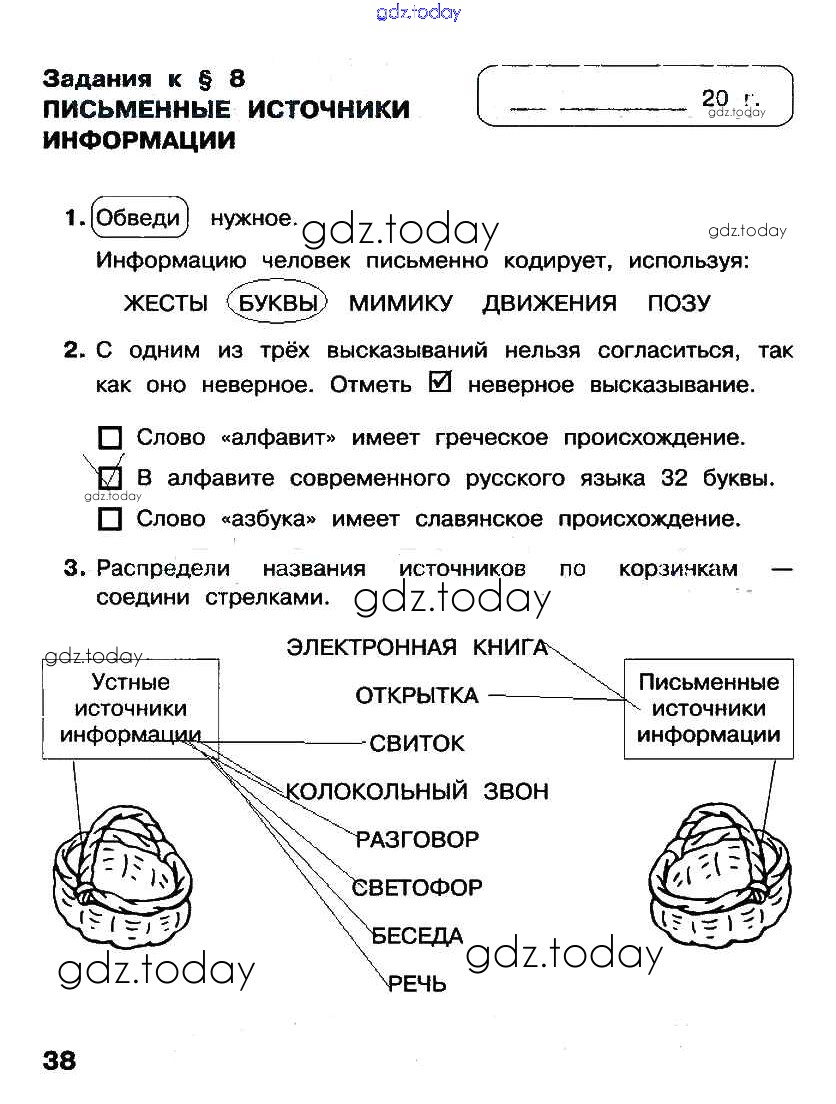 На страницах сайта gdz.today вы найдете учебный и вспомогательный материал, направленный на улучшения знаний школьной программы. ГДЗ - онлайн мир знаний §8. Письменные источники информации Решение к части 1. Страницы стр. 38 Рабочей тетради по Информатике для 2 класса Матвеева, Челак Бином УМК 2012
