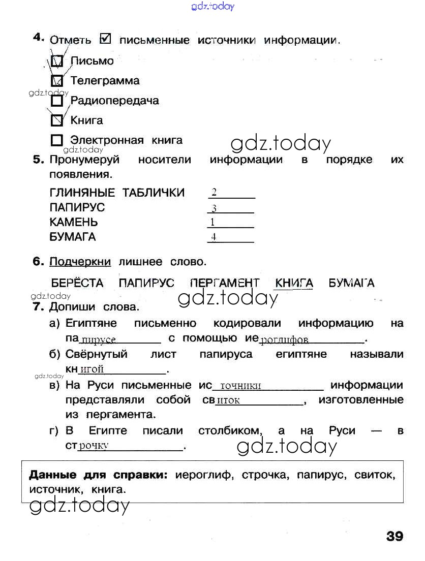 На страницах сайта gdz.today вы найдете учебный и вспомогательный материал, направленный на улучшения знаний школьной программы. ГДЗ - онлайн мир знаний §8. Письменные источники информации Решение к части 1. Страницы стр. 39 Рабочей тетради по Информатике для 2 класса Матвеева, Челак Бином УМК 2012