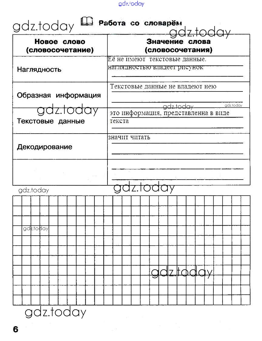 На страницах сайта gdz.today вы найдете учебный и вспомогательный материал, направленный на улучшения знаний школьной программы. ГДЗ - онлайн мир знаний §10. Текстовые данные Решение к части 2. Страницы стр. 6 Рабочей тетради по Информатике для 2 класса Матвеева, Челак Бином УМК 2012