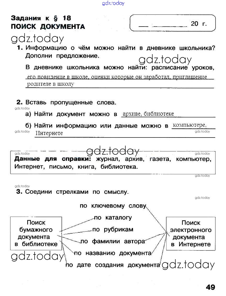 На страницах сайта gdz.today вы найдете учебный и вспомогательный материал, направленный на улучшения знаний школьной программы. ГДЗ - онлайн мир знаний §18. Поиск документа Решение к части 2. Страницы стр. 49 Рабочей тетради по Информатике для 2 класса Матвеева, Челак Бином УМК 2012