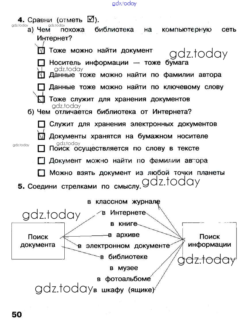 На страницах сайта gdz.today вы найдете учебный и вспомогательный материал, направленный на улучшения знаний школьной программы. ГДЗ - онлайн мир знаний §18. Поиск документа Решение к части 2. Страницы стр. 50 Рабочей тетради по Информатике для 2 класса Матвеева, Челак Бином УМК 2012