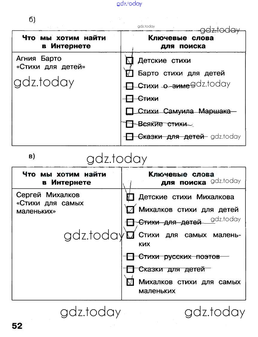 На страницах сайта gdz.today вы найдете учебный и вспомогательный материал, направленный на улучшения знаний школьной программы. ГДЗ - онлайн мир знаний §18. Поиск документа Решение к части 2. Страницы стр. 52 Рабочей тетради по Информатике для 2 класса Матвеева, Челак Бином УМК 2012
