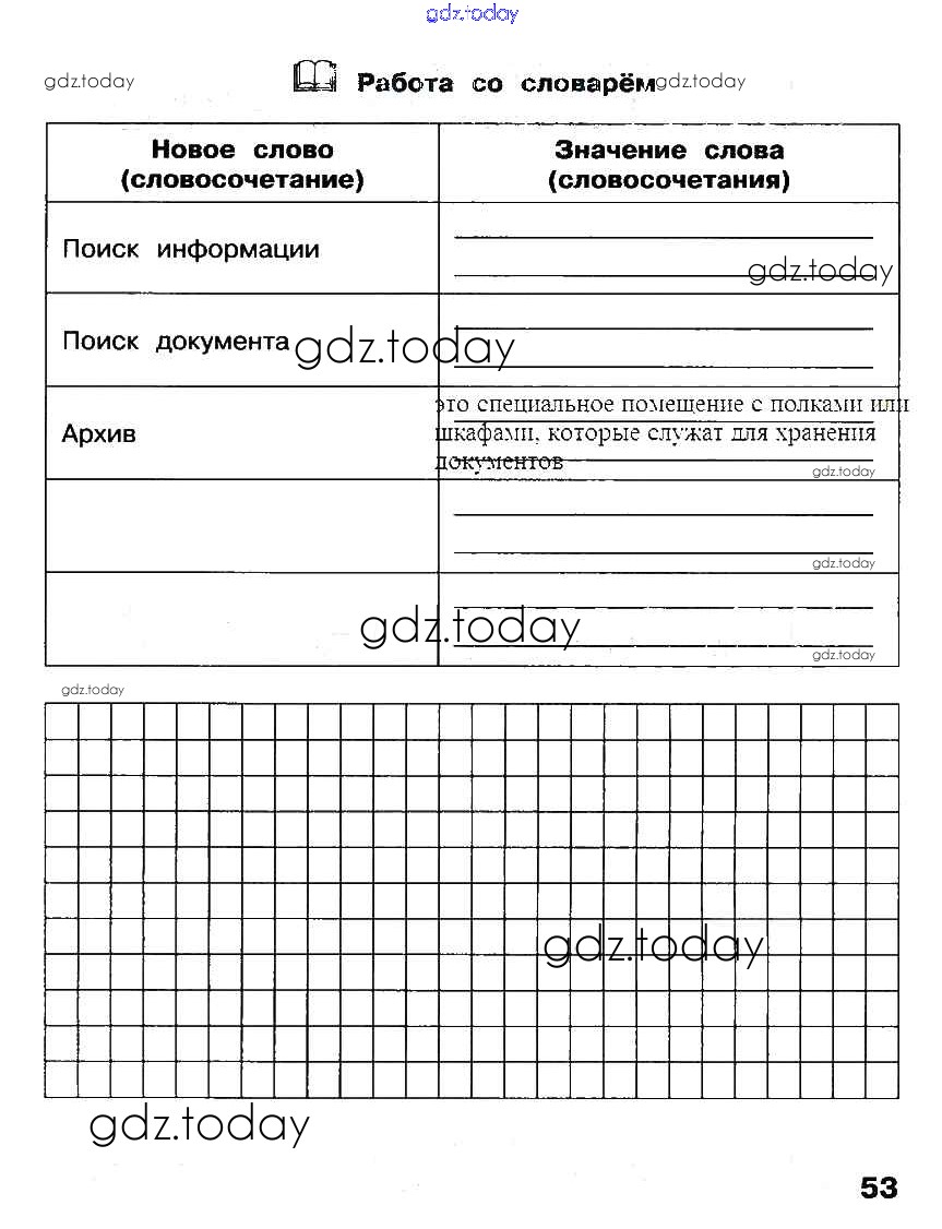 На страницах сайта gdz.today вы найдете учебный и вспомогательный материал, направленный на улучшения знаний школьной программы. ГДЗ - онлайн мир знаний §18. Поиск документа Решение к части 2. Страницы стр. 53 Рабочей тетради по Информатике для 2 класса Матвеева, Челак Бином УМК 2012