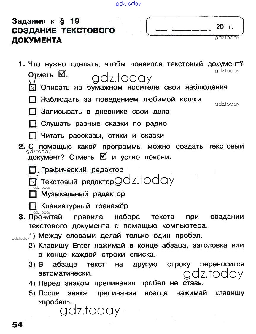На страницах сайта gdz.today вы найдете учебный и вспомогательный материал, направленный на улучшения знаний школьной программы. ГДЗ - онлайн мир знаний §19. Создание текстового документа Решение к части 2. Страницы стр. 54 Рабочей тетради по Информатике для 2 класса Матвеева, Челак Бином УМК 2012