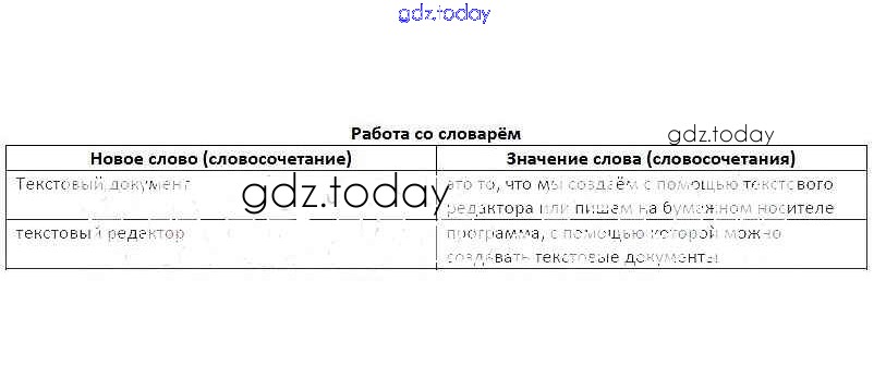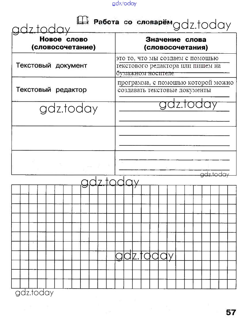 На страницах сайта gdz.today вы найдете учебный и вспомогательный материал, направленный на улучшения знаний школьной программы. ГДЗ - онлайн мир знаний §19. Создание текстового документа Решение к части 2. Страницы стр. 57 Рабочей тетради по Информатике для 2 класса Матвеева, Челак Бином УМК 2012