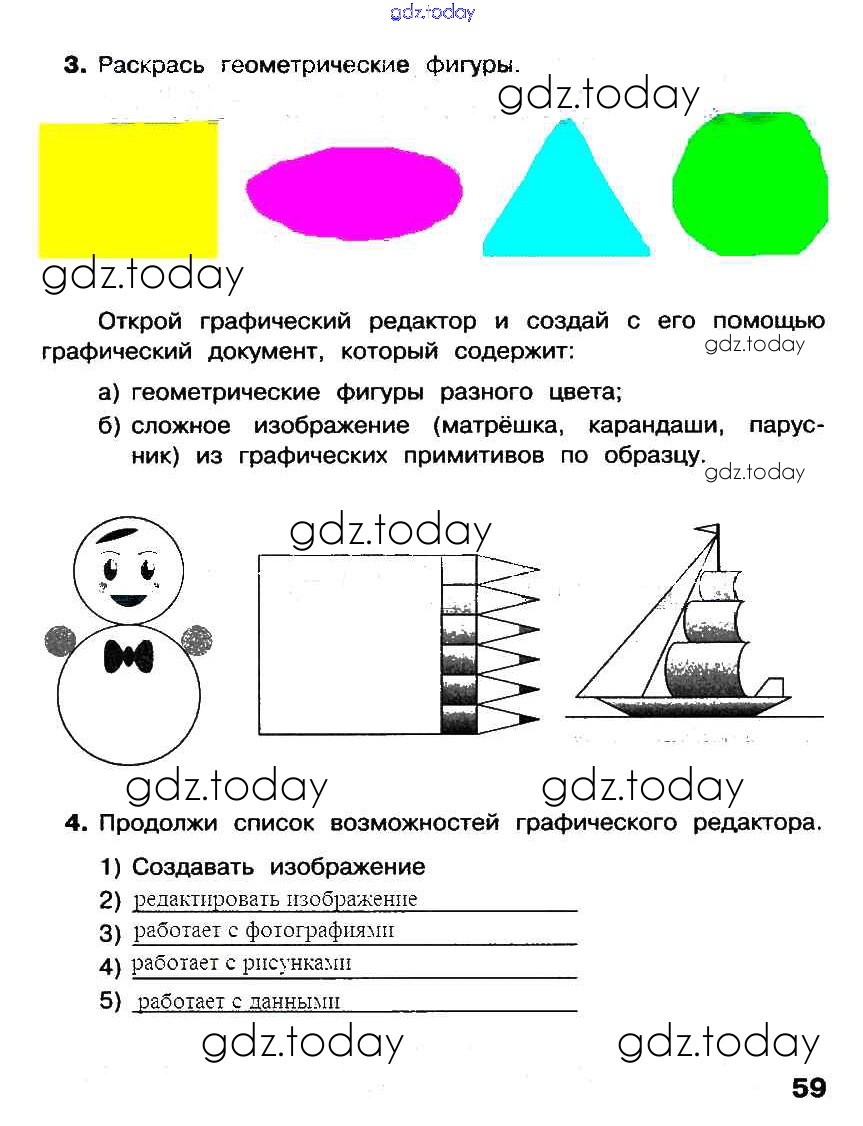На страницах сайта gdz.today вы найдете учебный и вспомогательный материал, направленный на улучшения знаний школьной программы. ГДЗ - онлайн мир знаний §20. Создание графического документа Решение к части 2. Страницы стр. 59 Рабочей тетради по Информатике для 2 класса Матвеева, Челак Бином УМК 2012