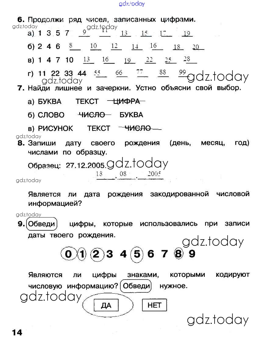 На страницах сайта gdz.today вы найдете учебный и вспомогательный материал, направленный на улучшения знаний школьной программы. ГДЗ - онлайн мир знаний §12. Числовая информация Решение к части 2. Страницы стр. 14 Рабочей тетради по Информатике для 2 класса Матвеева, Челак Бином УМК 2012