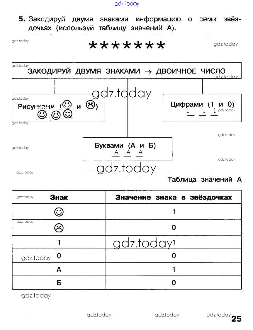 На страницах сайта gdz.today вы найдете учебный и вспомогательный материал, направленный на улучшения знаний школьной программы. ГДЗ - онлайн мир знаний §14. Двоичное кодирование Решение к части 2. Страницы стр. 25 Рабочей тетради по Информатике для 2 класса Матвеева, Челак Бином УМК 2012