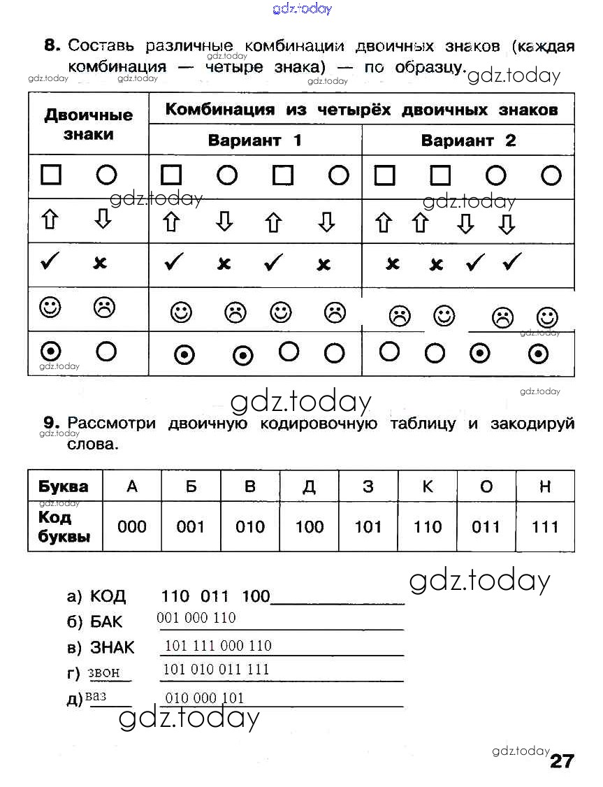 На страницах сайта gdz.today вы найдете учебный и вспомогательный материал, направленный на улучшения знаний школьной программы. ГДЗ - онлайн мир знаний §14. Двоичное кодирование Решение к части 2. Страницы стр. 27 Рабочей тетради по Информатике для 2 класса Матвеева, Челак Бином УМК 2012