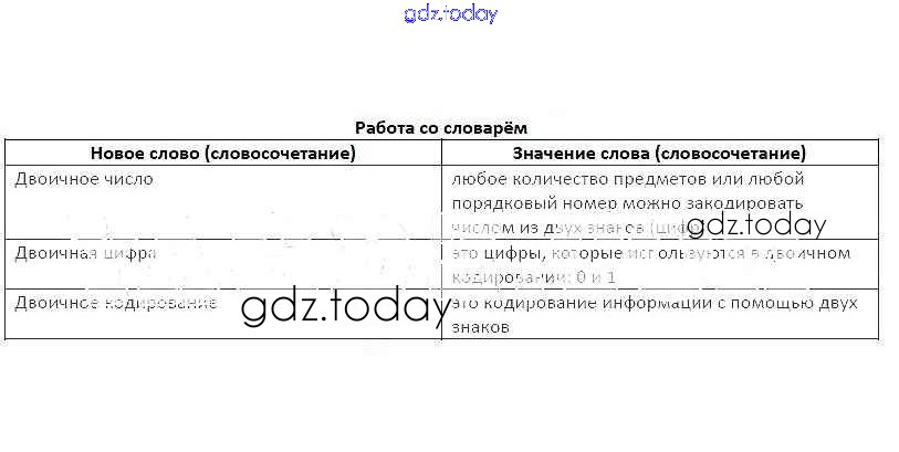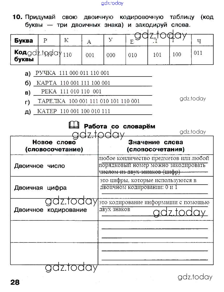 На страницах сайта gdz.today вы найдете учебный и вспомогательный материал, направленный на улучшения знаний школьной программы. ГДЗ - онлайн мир знаний §14. Двоичное кодирование Решение к части 2. Страницы стр. 28 Рабочей тетради по Информатике для 2 класса Матвеева, Челак Бином УМК 2012