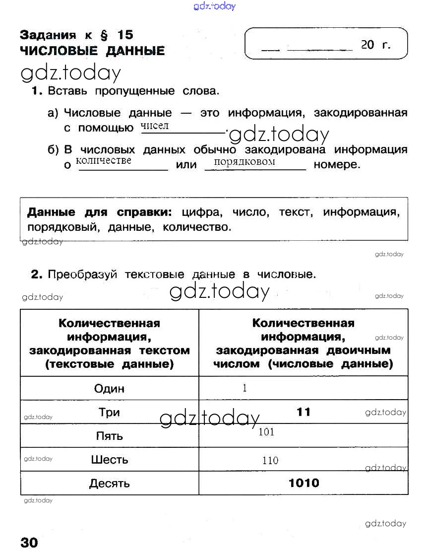 На страницах сайта gdz.today вы найдете учебный и вспомогательный материал, направленный на улучшения знаний школьной программы. ГДЗ - онлайн мир знаний §15. Числовые данные Решение к части 2. Страницы стр. 30 Рабочей тетради по Информатике для 2 класса Матвеева, Челак Бином УМК 2012