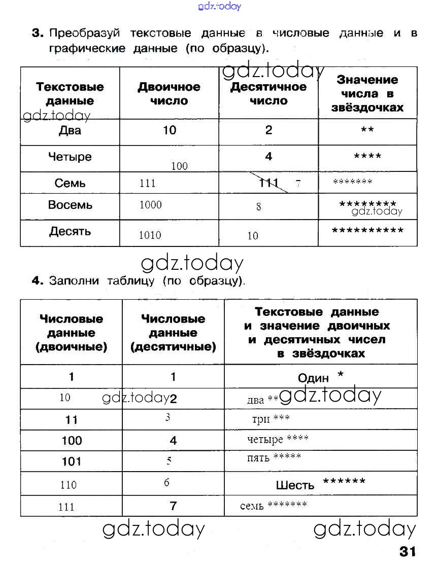 На страницах сайта gdz.today вы найдете учебный и вспомогательный материал, направленный на улучшения знаний школьной программы. ГДЗ - онлайн мир знаний §15. Числовые данные Решение к части 2. Страницы стр. 31 Рабочей тетради по Информатике для 2 класса Матвеева, Челак Бином УМК 2012