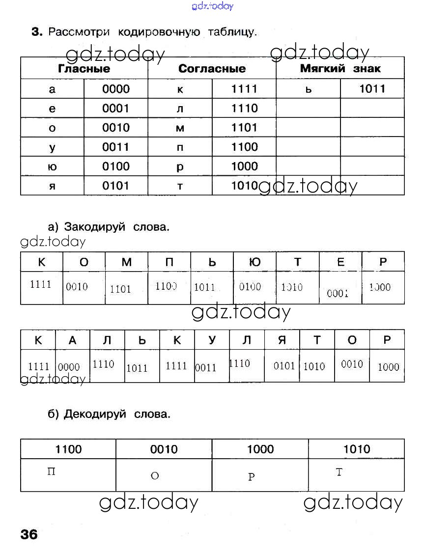 На страницах сайта gdz.today вы найдете учебный и вспомогательный материал, направленный на улучшения знаний школьной программы. ГДЗ - онлайн мир знаний Повторение к главе 3 Решение к части 2. Страницы стр. 36 Рабочей тетради по Информатике для 2 класса Матвеева, Челак Бином УМК 2012