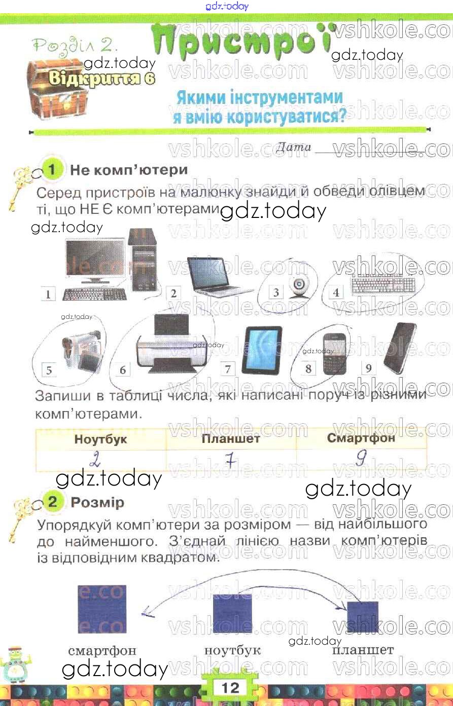 На страницах сайта gdz.today вы найдете учебный и вспомогательный материал, направленный на улучшения знаний школьной программы. ГДЗ - онлайн мир знаний Рішення до Сторінки 12 Рабочей тетради по Информатике для 2 класса Барна, Морзе Орiон 2019