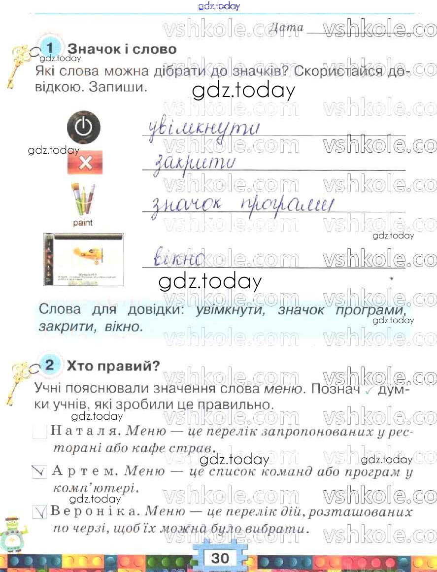 На страницах сайта gdz.today вы найдете учебный и вспомогательный материал, направленный на улучшения знаний школьной программы. ГДЗ - онлайн мир знаний Рішення до Сторінки 30 Рабочей тетради по Информатике для 2 класса Барна, Морзе Орiон 2019
