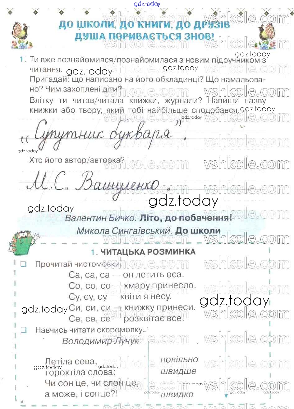 На страницах сайта gdz.today вы найдете учебный и вспомогательный материал, направленный на улучшения знаний школьной программы. ГДЗ - онлайн мир знаний Рішення до Сторінки 1 Рабочей тетради по Литературе для 2 класса Савченко Орiон 2019