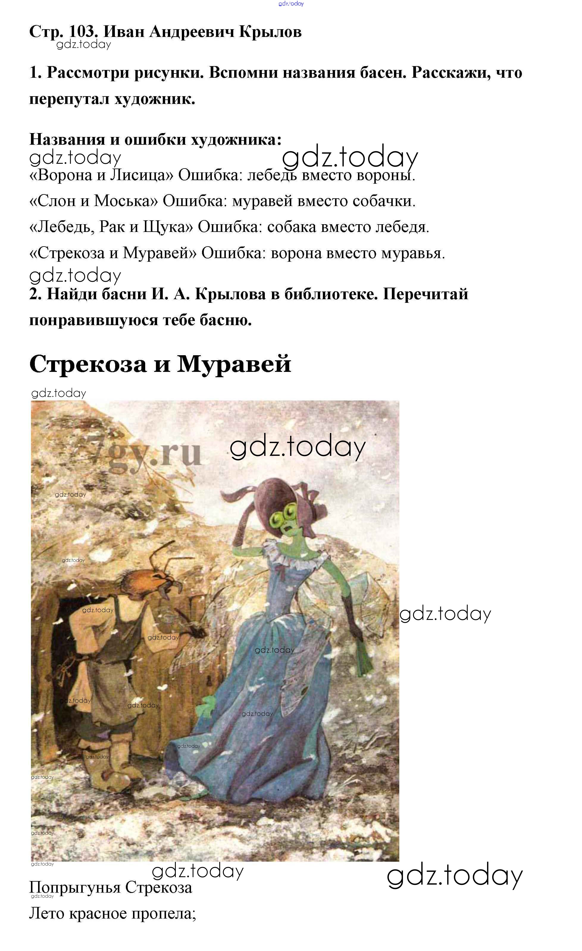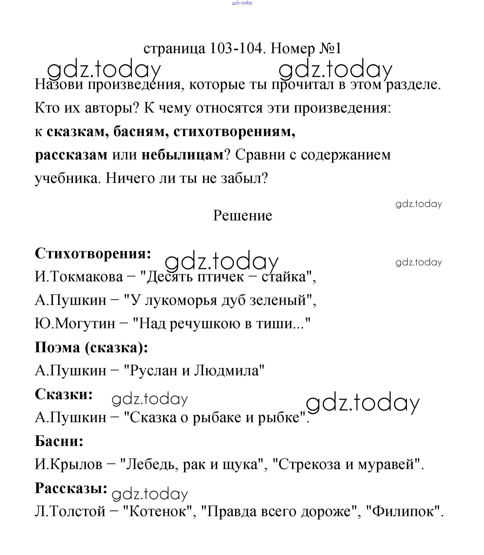 На страницах сайта gdz.today вы найдете учебный и вспомогательный материал, направленный на улучшения знаний школьной программы. ГДЗ - онлайн мир знаний Решение к части 1 (Страницы) 103 Учебнику по Литературному чтению для 2 класса Климанова, Горецкий Просвещение Школа России 2018