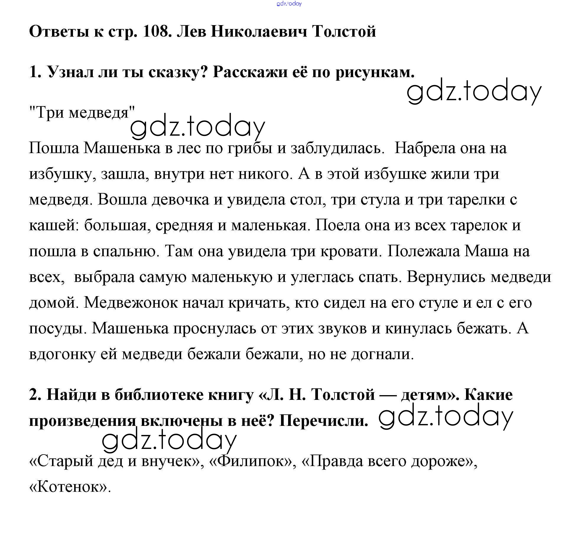 На страницах сайта gdz.today вы найдете учебный и вспомогательный материал, направленный на улучшения знаний школьной программы. ГДЗ - онлайн мир знаний Решение к части 1 (Страницы) 108 Учебнику по Литературному чтению для 2 класса Климанова, Горецкий Просвещение Школа России 2018