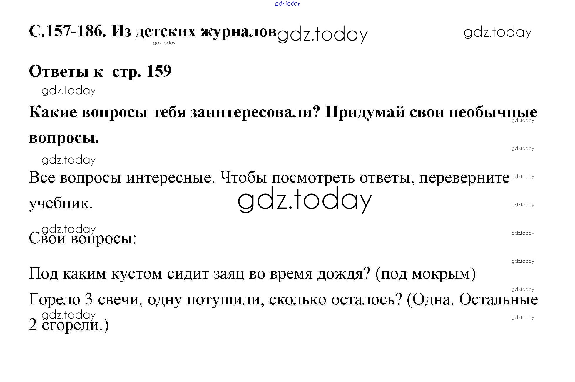 На страницах сайта gdz.today вы найдете учебный и вспомогательный материал, направленный на улучшения знаний школьной программы. ГДЗ - онлайн мир знаний Решение к части 1 (Страницы) 159 Учебнику по Литературному чтению для 2 класса Климанова, Горецкий Просвещение Школа России 2018