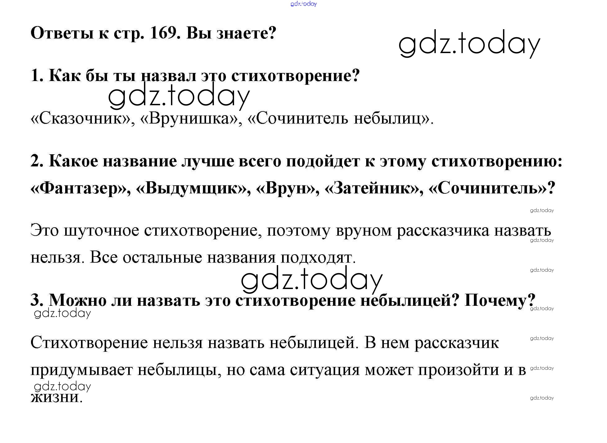 На страницах сайта gdz.today вы найдете учебный и вспомогательный материал, направленный на улучшения знаний школьной программы. ГДЗ - онлайн мир знаний Решение к части 1 (Страницы) 169 Учебнику по Литературному чтению для 2 класса Климанова, Горецкий Просвещение Школа России 2018