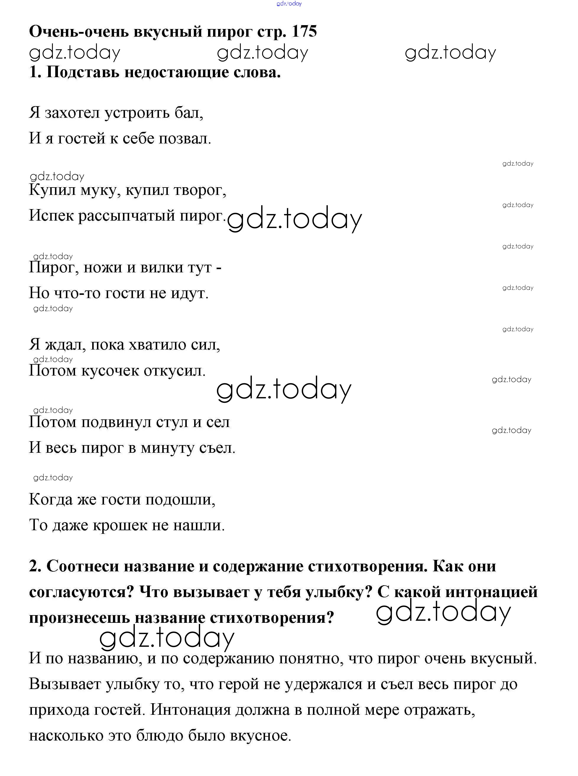 На страницах сайта gdz.today вы найдете учебный и вспомогательный материал, направленный на улучшения знаний школьной программы. ГДЗ - онлайн мир знаний Решение к части 1 (Страницы) 175 Учебнику по Литературному чтению для 2 класса Климанова, Горецкий Просвещение Школа России 2018