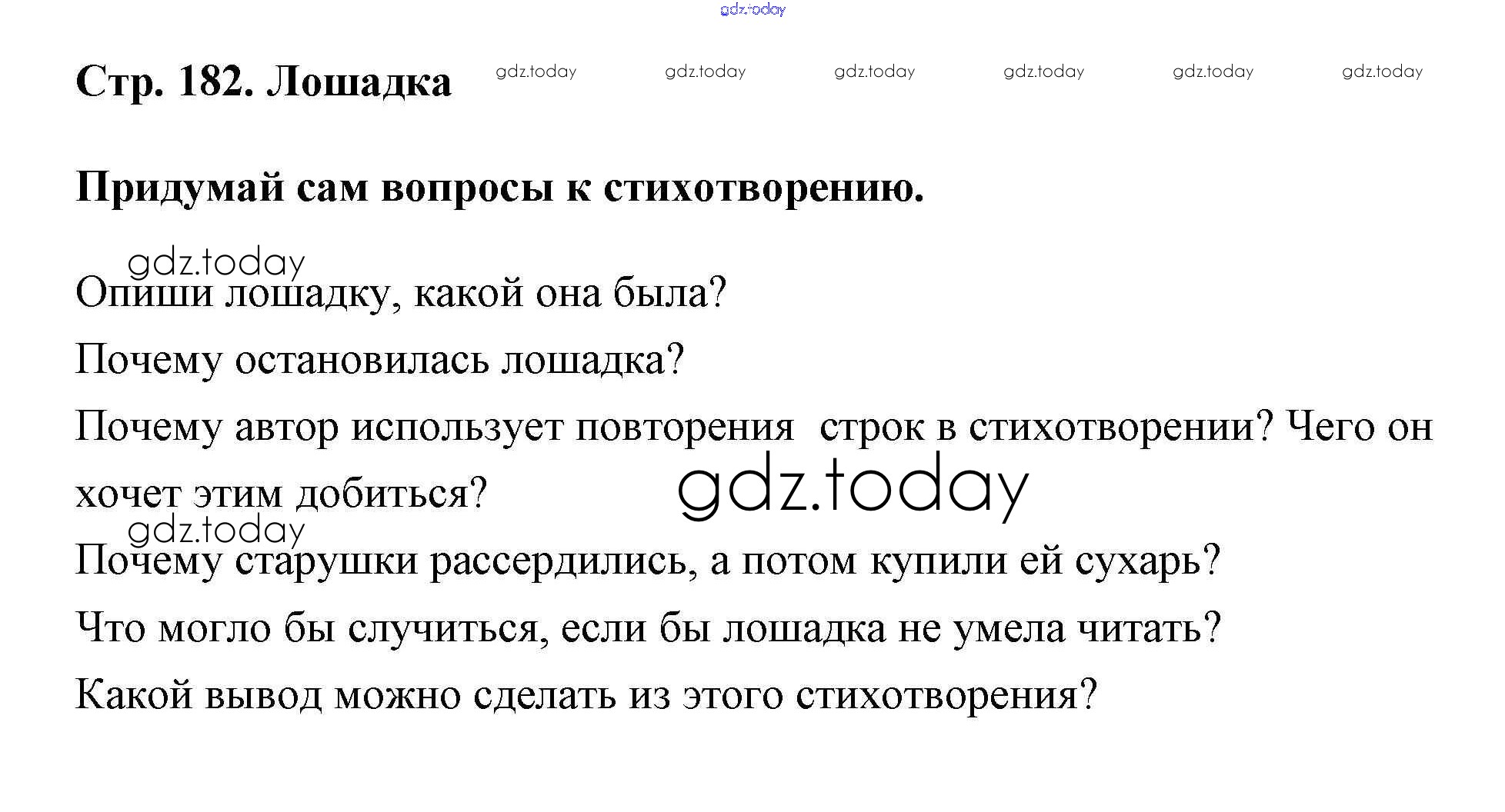 На страницах сайта gdz.today вы найдете учебный и вспомогательный материал, направленный на улучшения знаний школьной программы. ГДЗ - онлайн мир знаний Решение к части 1 (Страницы) 182 Учебнику по Литературному чтению для 2 класса Климанова, Горецкий Просвещение Школа России 2018