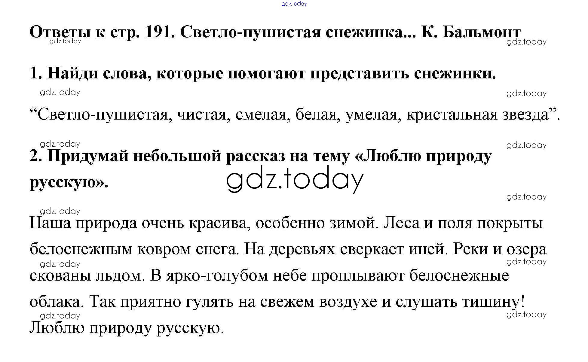 На страницах сайта gdz.today вы найдете учебный и вспомогательный материал, направленный на улучшения знаний школьной программы. ГДЗ - онлайн мир знаний Решение к части 1 (Страницы) 191 Учебнику по Литературному чтению для 2 класса Климанова, Горецкий Просвещение Школа России 2018