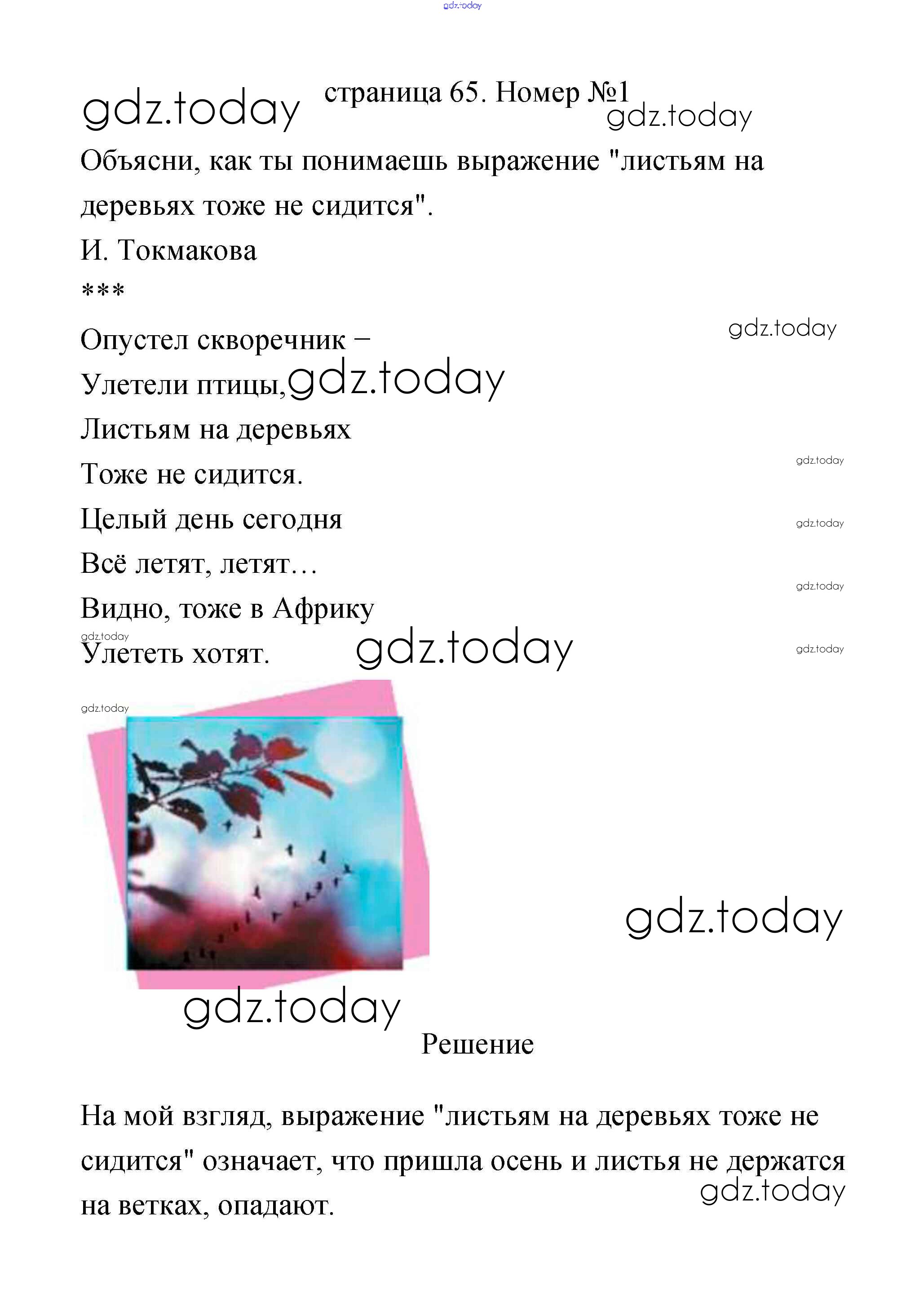 На страницах сайта gdz.today вы найдете учебный и вспомогательный материал, направленный на улучшения знаний школьной программы. ГДЗ - онлайн мир знаний Решение к части 1 (Страницы) 65 Учебнику по Литературному чтению для 2 класса Климанова, Горецкий Просвещение Школа России 2018