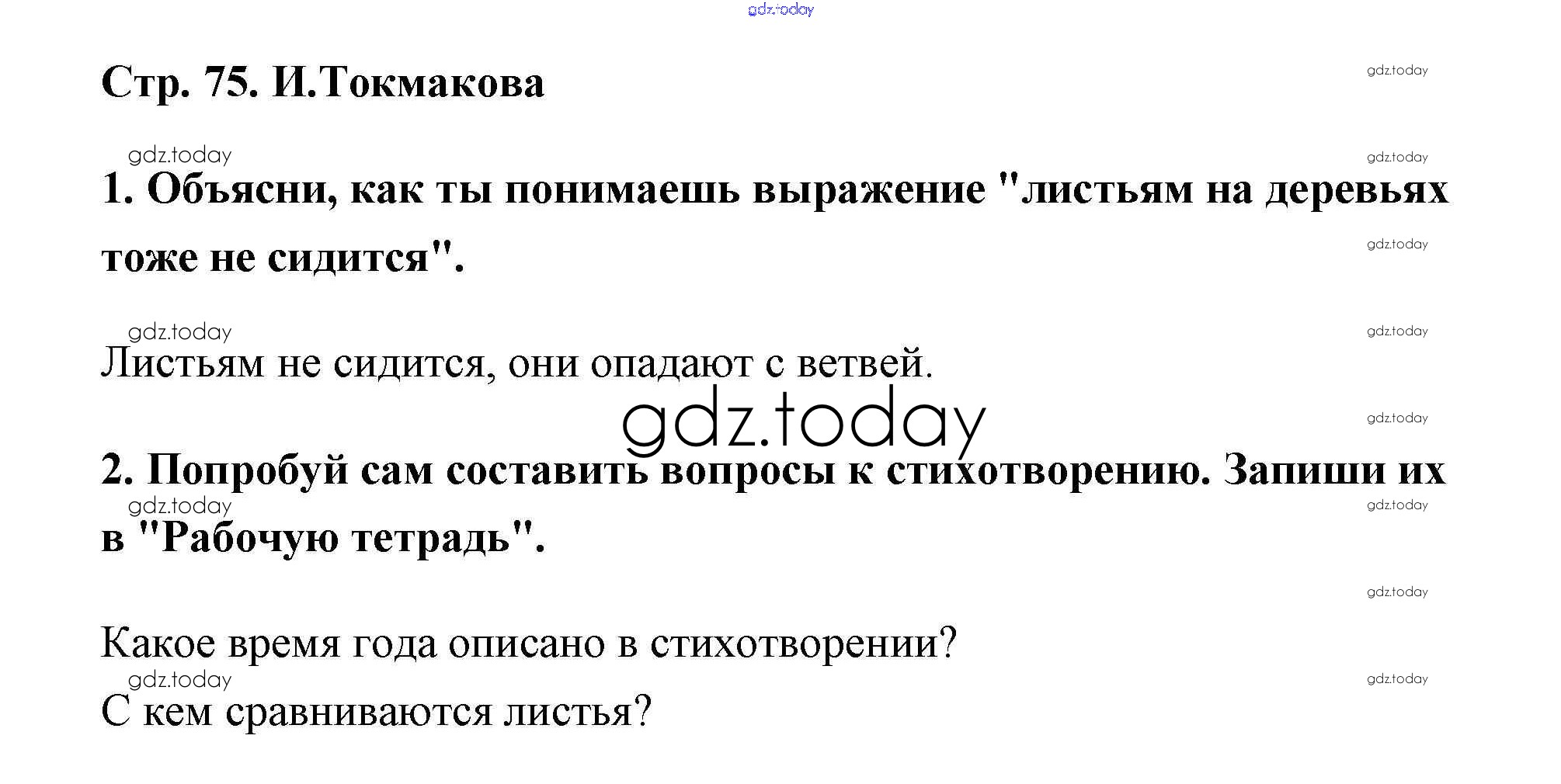 На страницах сайта gdz.today вы найдете учебный и вспомогательный материал, направленный на улучшения знаний школьной программы. ГДЗ - онлайн мир знаний Решение к части 1 (Страницы) 75 Учебнику по Литературному чтению для 2 класса Климанова, Горецкий Просвещение Школа России 2018
