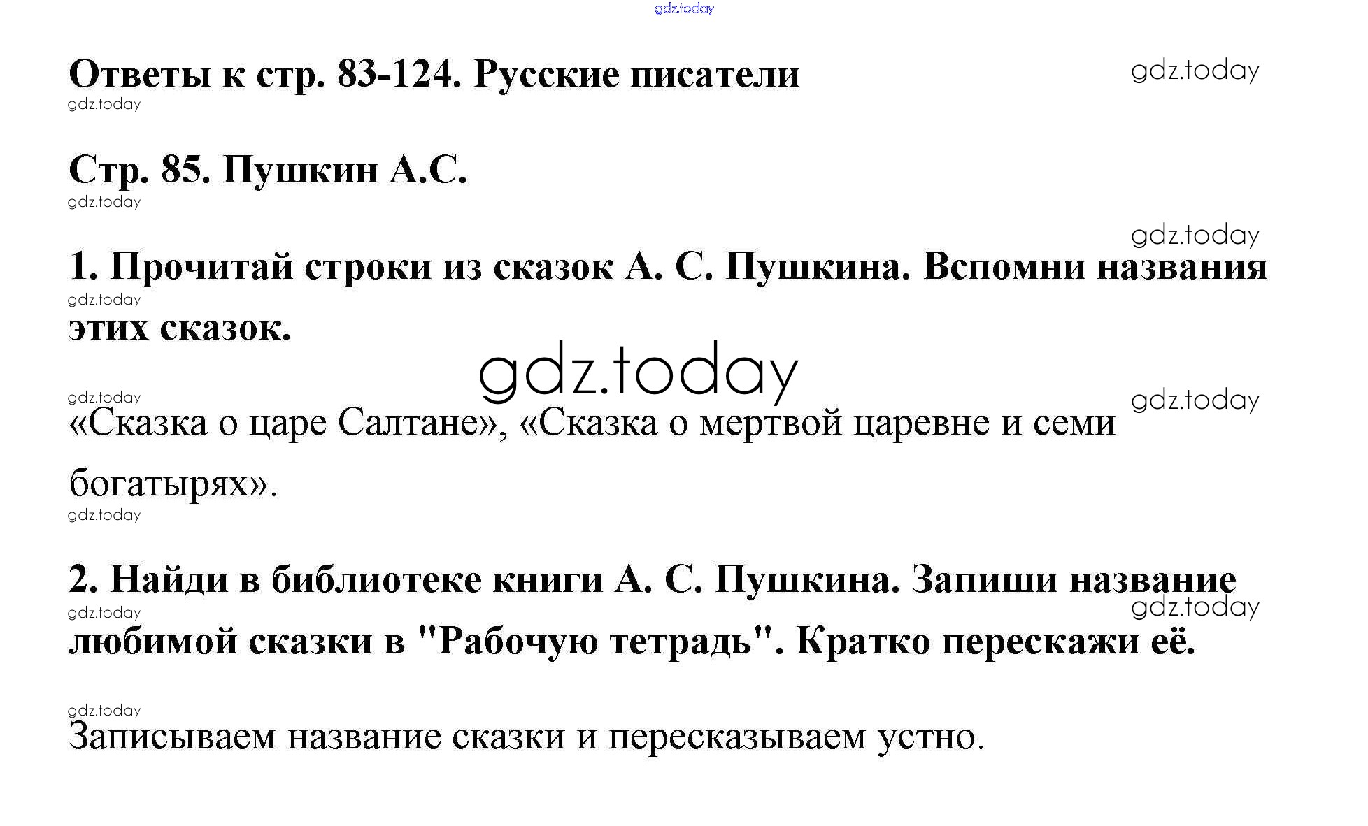 На страницах сайта gdz.today вы найдете учебный и вспомогательный материал, направленный на улучшения знаний школьной программы. ГДЗ - онлайн мир знаний Решение к части 1 (Страницы) 85 Учебнику по Литературному чтению для 2 класса Климанова, Горецкий Просвещение Школа России 2018