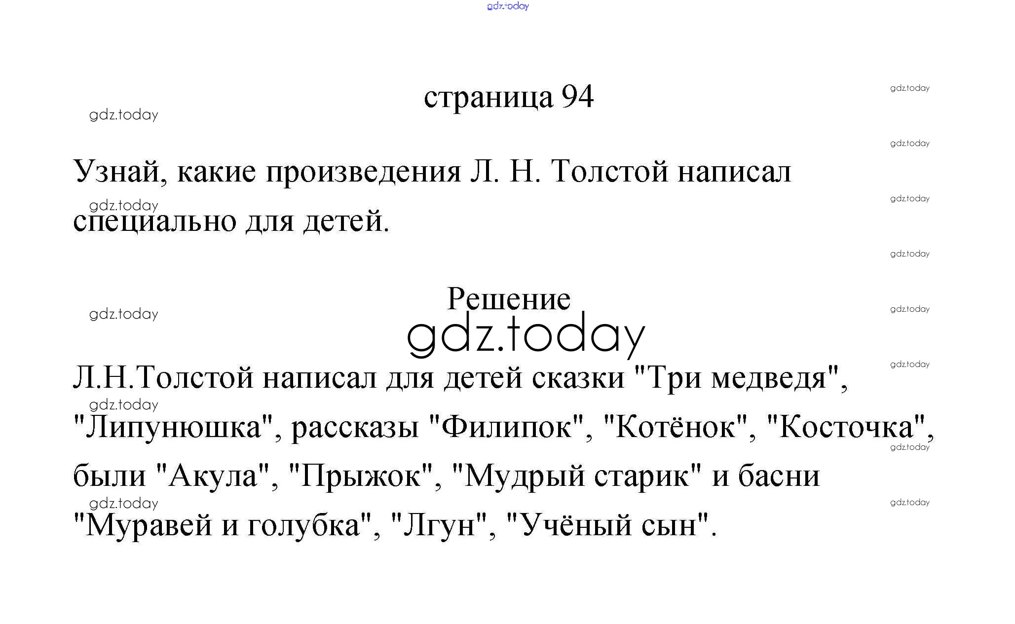 На страницах сайта gdz.today вы найдете учебный и вспомогательный материал, направленный на улучшения знаний школьной программы. ГДЗ - онлайн мир знаний Решение к части 1 (Страницы) 94 Учебнику по Литературному чтению для 2 класса Климанова, Горецкий Просвещение Школа России 2018