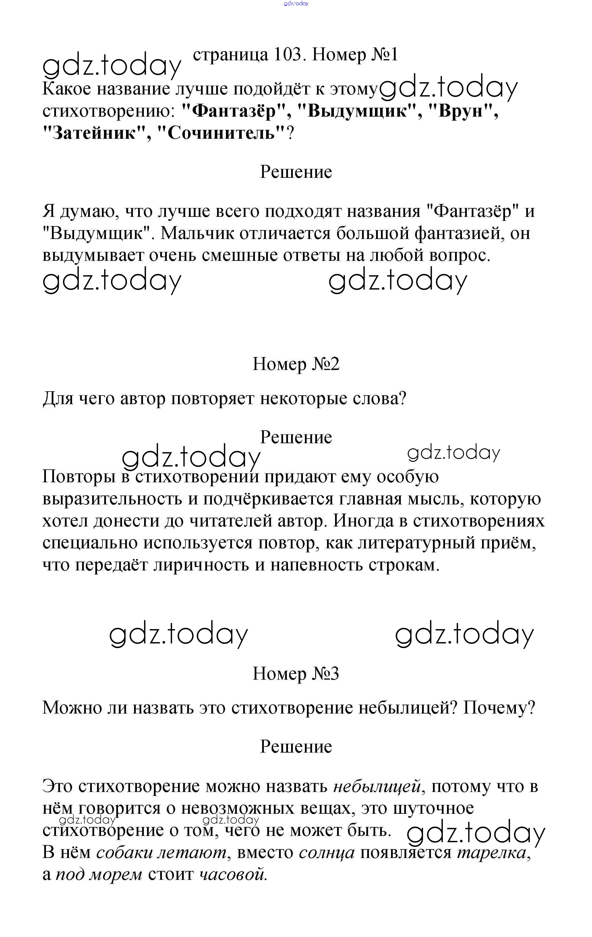 На страницах сайта gdz.today вы найдете учебный и вспомогательный материал, направленный на улучшения знаний школьной программы. ГДЗ - онлайн мир знаний Решение к части 2 (Страницы) 103 Учебнику по Литературному чтению для 2 класса Климанова, Горецкий Просвещение Школа России 2018