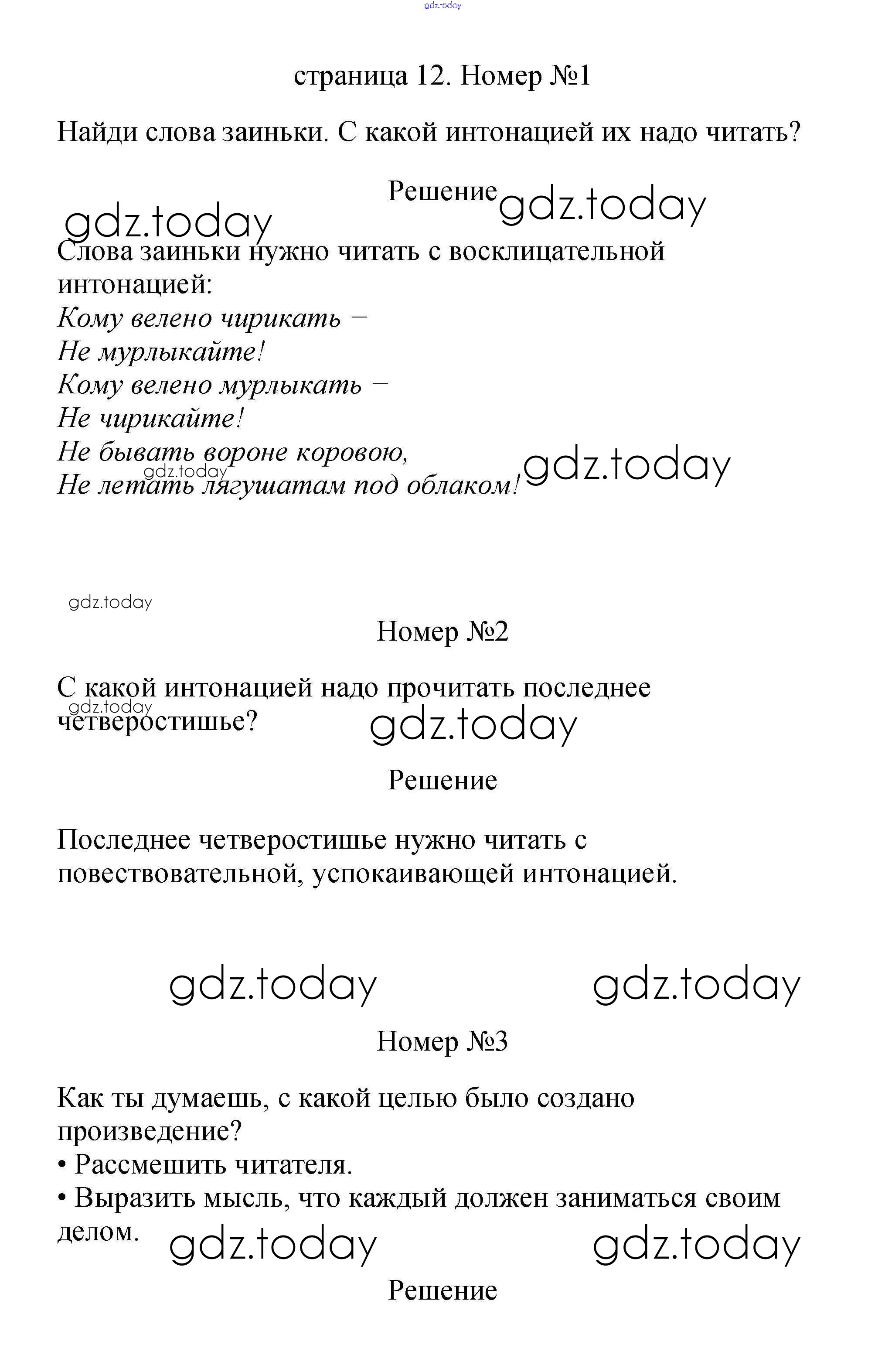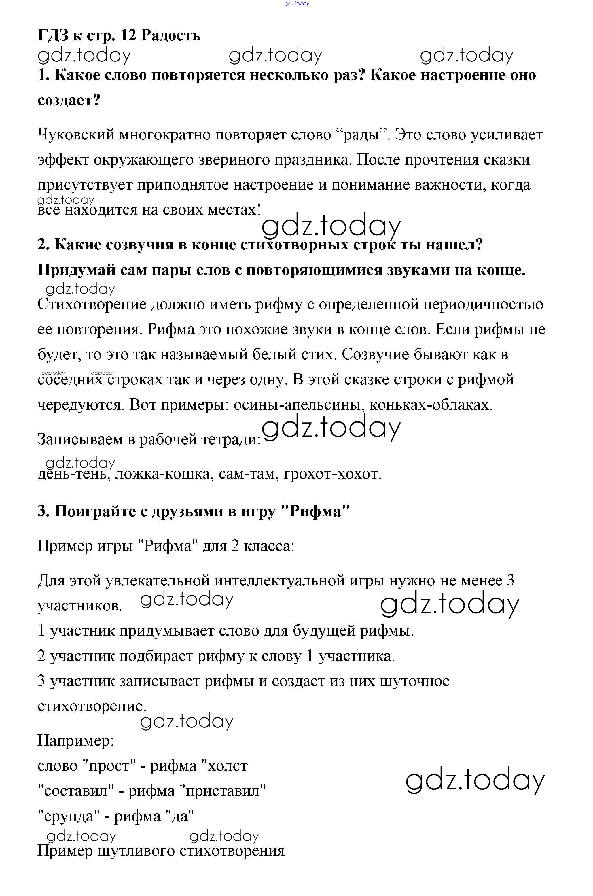 На страницах сайта gdz.today вы найдете учебный и вспомогательный материал, направленный на улучшения знаний школьной программы. ГДЗ - онлайн мир знаний Решение к части 2 (Страницы) 12 Учебнику по Литературному чтению для 2 класса Климанова, Горецкий Просвещение Школа России 2018