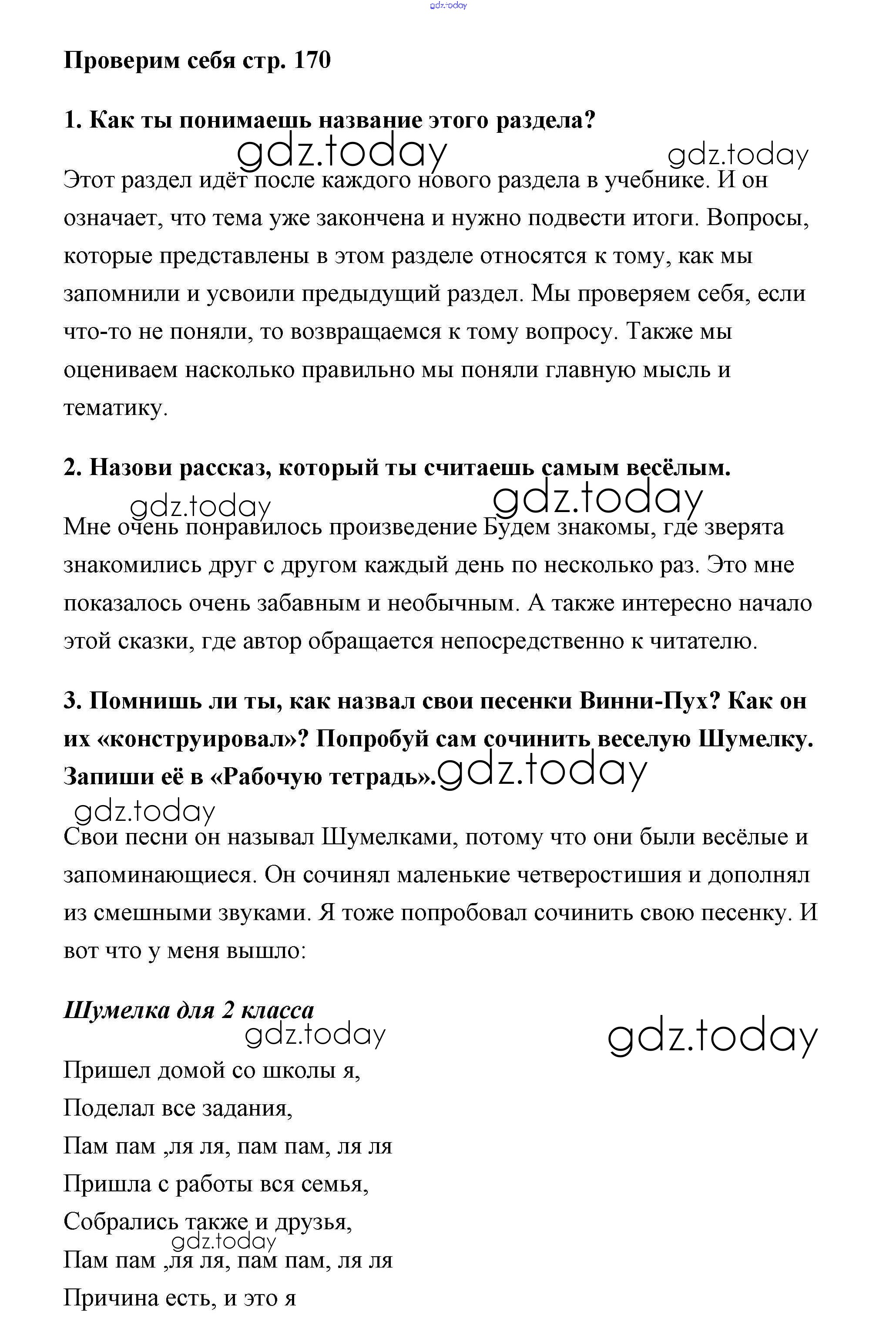 На страницах сайта gdz.today вы найдете учебный и вспомогательный материал, направленный на улучшения знаний школьной программы. ГДЗ - онлайн мир знаний Решение к части 2 (Страницы) 170 Учебнику по Литературному чтению для 2 класса Климанова, Горецкий Просвещение Школа России 2018