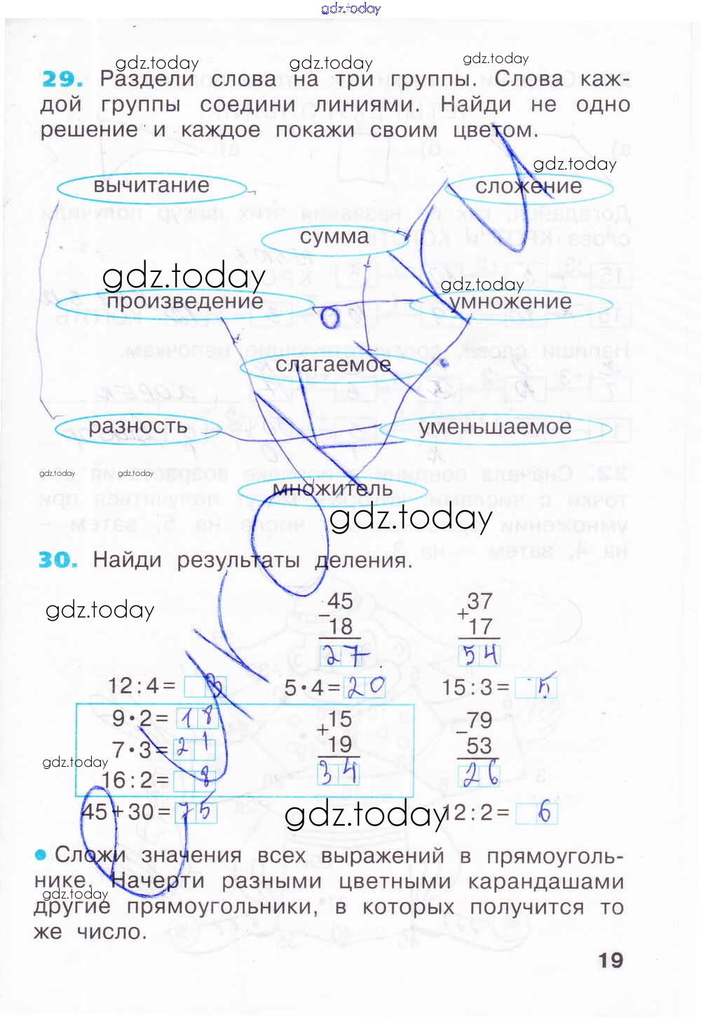 На страницах сайта gdz.today вы найдете учебный и вспомогательный материал, направленный на улучшения знаний школьной программы. ГДЗ - онлайн мир знаний Решение к тетради 3. Страницы 19 Рабочей тетради по Математике для 2 класса Бененсон, Итина Фёдоров 2015