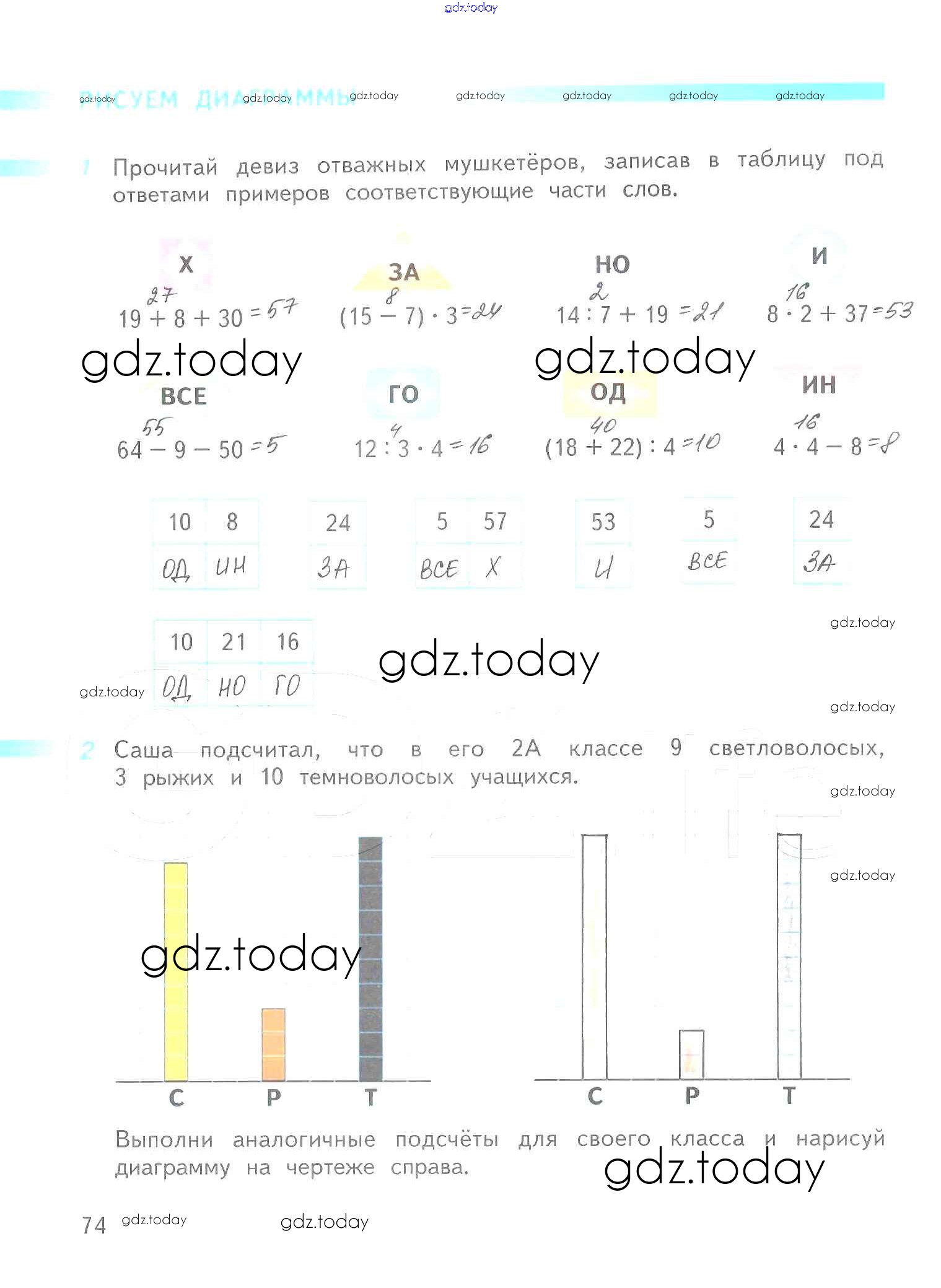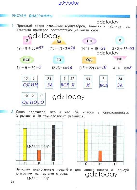 На страницах сайта gdz.today вы найдете учебный и вспомогательный материал, направленный на улучшения знаний школьной программы. ГДЗ - онлайн мир знаний Решение к части 2. Страницы 74 Рабочей тетради по Математике для 2 класса Дорофеев, Миракова Просвещение Перспектива 2015