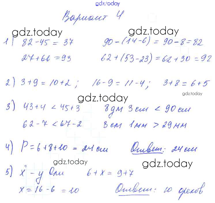 На страницах сайта gdz.today вы найдете учебный и вспомогательный материал, направленный на улучшения знаний школьной программы. ГДЗ - онлайн мир знаний Итоговая контрольная работа за 3 четверть. Контрольная работа 1 Решение 2 класс Вариант 4 Контрольным работам по Математике для 2-4 класса Волкова Просвещение Школа России 2017