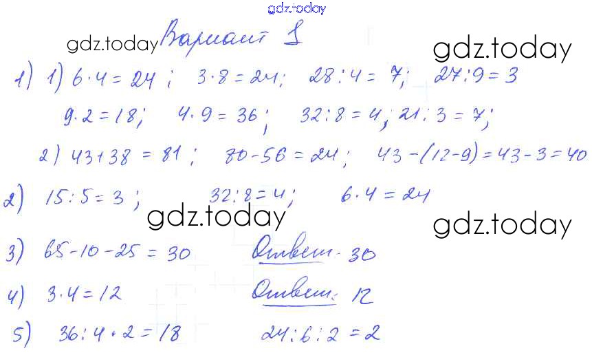 На страницах сайта gdz.today вы найдете учебный и вспомогательный материал, направленный на улучшения знаний школьной программы. ГДЗ - онлайн мир знаний Тема «Умножение и деление» стр. 35 Решение 3 класс Вариант 1 Контрольным работам по Математике для 2-4 класса Волкова Просвещение Школа России 2017