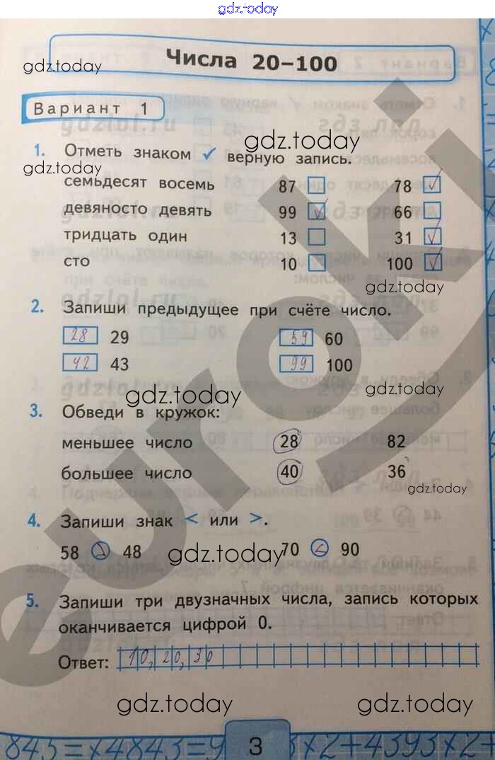 На страницах сайта gdz.today вы найдете учебный и вспомогательный материал, направленный на улучшения знаний школьной программы. ГДЗ - онлайн мир знаний Числа 20—100 Решение к части 1 Вар-1 Контрольным работам по Математике для 2 класса Рудницкая Экзамен УМК 2017
