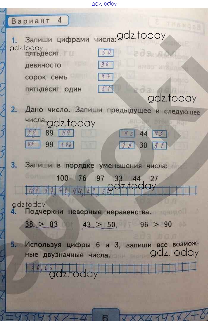 На страницах сайта gdz.today вы найдете учебный и вспомогательный материал, направленный на улучшения знаний школьной программы. ГДЗ - онлайн мир знаний Числа 20—100 Решение к части 1 Вар-4 Контрольным работам по Математике для 2 класса Рудницкая Экзамен УМК 2017